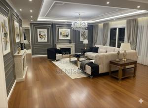Canapé sectionnel : Un grand canapé d'angle de couleur claire (beige/crème) avec des coussins d'assise et de dossier rembourrés, et des accoudoirs potentiellement en bois clair avec des détails foncés. Le tissu semble texturé, peut-être un lin ou un mélange de coton.