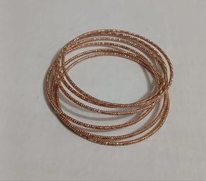 Bracelets jonc (ou jonc) de couleur or rose avec une finition texturée ou martelée. Ils sont généralement conçus pour être portés ensemble, en set (ou « accumulés »), pour un effet visuel plus marqué.