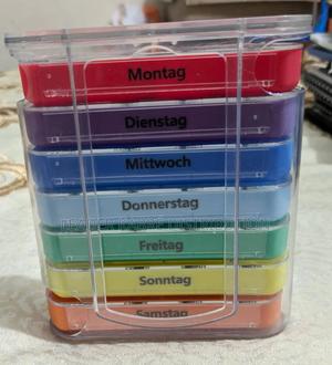 Pilulier semainier avec des compartiments pour chaque jour de la semaine, écrits en allemand.