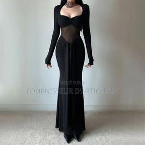 Robe longue à manches longues en patchwork de maille nouée , élégants plis en maille, jupe moulante sexy et séduisante
