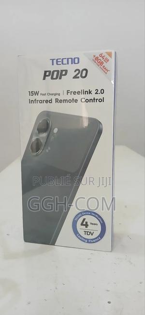 Le Tecno Pop 20 (version 64 Go) est un smartphone d'entrée de gamme 4G doté d'un grand écran de 6,67 à 6,75 pouces, d'une batterie de 5000 mAh avec charge 15W, et de 4 Go de RAM (extensible à 8 Go). Android (14 Go) et est équipé d'un capteur photo arrière de 13 MP et d'un capteur avant de 8 MP, avec un design en plastique et la certification IP64.