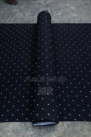 Tissu noir à pois blancs de haute qualité, idéal pour confection de robes longues, robes moulantes, ensembles chics et autres créations féminines.